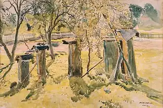The special exhibition in the "Zachęta" (1904) demonstrated 58 Masłowski's watercolours. In 1905–1907 Masłowski worked experimenting in his Warsaw studio (at Mokotowska street). He did illustrations for "Pan Tadeusz" (special edition in 1905 for subscribers of "Rozwój" Publishers in Łódź),[23][24] as well as other figure compositions, for instance a full of rhythm and expressive image of "Pijani Chłopi" (en. Drunken Peasants, 1906, National Museum in Warsaw), the scene of the Revolution of 1905 – "Patrol Kozaków" (en. Cossacks Patrol"), also known as "Wiosna 1905" (en. Spring 1905) or "Świt 1906" (en. Dawn 1906 – painting of 1906, Museum of Art in Łódź),[25][26][27][28] picture "Pierwsze żyto" (en. First Rye, 1907) and rare attempt of symbolism in Masłowski's work – Świątynia Sztuki" (en. The Temple of Art, 1907, lost). In autumn of 1907 the charming landscapes of Radziejowice was created – combining graphic lines with the painterly clarity of stains, such as "Pond in Radziejowice" (1907). Plein air in Nowosiółka on Volhynia in 1908 brought 18 watercolors exhibited in the "Zacheta" – Society for the Encouragement of Fine Arts.