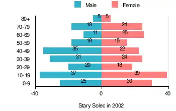 According to the 2002 Poland census, there were 402 people residing in Stary Solec village, of whom 49.8% were male and 50.2% were female. In the village, the population was spread out, with 27.6% under the age of 18, 37.3% from 18 to 44, 14.2% from 45 to 64, and 20.9% who were 65 years of age or older.[1]