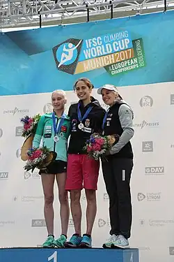 Gejo at the 2017 European Champion in Bouldering – with Janja Garnbret in second and Petra Klingler in third place