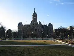 State Street enters Salt Lake City at 2100 South (State Route 201) and immediately passes west of the Salt Lake County Government Center. North of 1700 South, it passes west of a Salt Lake Community College campus built around the former South High School and then passes west of the Liberty Wells neighborhood. North of 900 South (former State Route 176) State Street has traffic signals every block, which is a change from the long signal spacings (often a half-mile or more) that benefit long-distance traffic further south. Outside of the somewhat similar Murray Downtown Historic District, the frontage from 700 South to 600 South is unique within State Street's length due to its uninterrupted mix of zero-setback pre-war-style buildings. 500 South and 600 South (both State Route 269) are one-way streets that provide access to and from I-15, respectively. Between 500 South and 400 South, State Street passes between the Scott Matheson State Courthouse and Washington Square, site of the City and County Building. The UTA TRAX Red Line crosses State Street in the median of 400 South. 400 South is also where US Highway 89 turns west to bypass the core of downtown; State Street north of 400 South as well as 400 South west of State Street have the State Route 186 designation instead.[1]