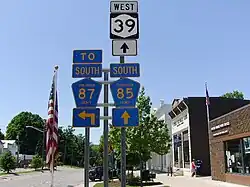 NY 39 begins at U.S. Route 20 in Sheridan. It is an east–west highway that extends for a total of 98.89 miles (159.15 km) through five Western New York counties. 11.13 miles (17.91 km) of its path goes through Chautauqua County.[1] In Chautauqua County, NY 39 passes through Sheridan, Hanover and Forestville.