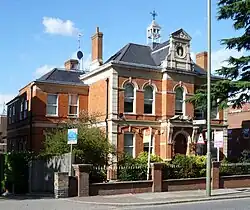 The road is a mix of semi-detached and detached houses in the west, small apartment blocks, and large office buildings in the east near the station that are characteristic, according to Pevsner and Cherry, of the fashion in the 1960s for out-of-town offices near transport hubs.[1] Most of those blocks have been converted to flats in whole or part since 2000, including Basil Court, Endeavour House, Kingmaker House, Groupama House, Comer House, and Castle House.[2]