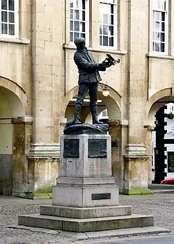 A memorial statue to the aviation pioneer Charles Rolls stands in front of the Shire Hall in Agincourt Square, Monmouth, Wales. The 8 feet (2.4 m) high bronze statue was designed by Sir William Goscombe John, R.A.[2] and Sir Aston Webb, R.A. designed the pink granite plinth.[2] The statue is a Grade II* listed structure.[1]