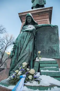 By the foot of the pedestal there is a young woman wrapped in bearskin, symbolising Maiden of Finland. She is holding a laurel wreath and an inscription with the words of three verses of the Finnish national anthem in Runeberg's native language Swedish.[1]