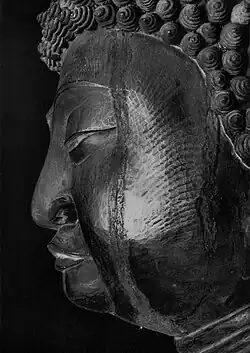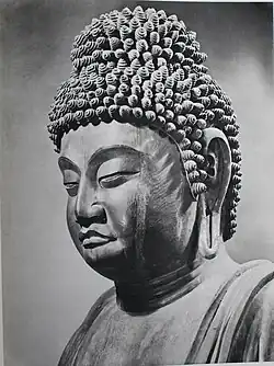 The minimalistic embellishment of the hinoki is the signature of the early Heian "plain-wood style". A light amount of pigment was utilized on the Yakushi Nyorai, with a metallic green tone of the hair, white sclera, black pupils, and cinnabar lips.[4] Remnants of chisel marks on the face also accentuate the wood as an essential medium of the sculpture.[3][4][5]