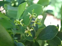Stenocarpus umbelliferus is a species of flowering plant in the family Proteaceae. It is endemic to New Caledonia.[2] It has a prostrate or upright habit, growing up to 5 metres in height. Stems are flattened when young, later becoming rounded. The leaves are thick and leathery with a slightly wavy margin. These may be ovate, elliptic, lanceolate or spathulate in shape with petioles that are 3 to 12 mm long. White, cream or pale yellow flowers occur in groups of 3 to 8 per umbel. These are followed by dark-coloured glabrous follicles that are 25 to 80 mm long and 3 to 5 mm wide.[2]