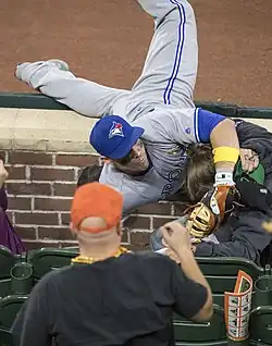 On May 14, 2017, Pearce suffered a strained calf while sliding into second base during a game against the Seattle Mariners; forcing him to leave the game and subsequently be placed on the disabled list.[35] He returned to the lineup on June 16 and hit a home run against the Chicago White Sox.[36] Pearce hit the third walk-off grand slam in franchise history on July 27, lifting the Blue Jays to an 8–4 victory and a four-game sweep of the Oakland Athletics.[37] Three days later, he hit another walk-off grand slam, giving the Blue Jays an 11–10 win over the Los Angeles Angels. In doing so, Pearce became the 29th player in MLB history to hit an ultimate grand slam, and the third player to hit two walk-off grand slams in a season, joining Cy Williams and Jim Presley, who did so in 1926 and 1986 respectively. Pearce also became the first player in MLB history to hit multiple walk-off grand slams within the span of a single week.[38][39] With the 2017 Blue Jays, Pearce batted .252 in 92 games, with 13 home runs and 37 RBIs.