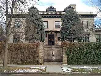 Stoiber Mansion, also called Stoiberhof, was built in 1907. The three-story Renaissance Revival house was designed by the Denver architectural firm Marean and Norton.[2] The 30-room house[3] was intended to be a social center, with a 50-foot entrance hall, a main-floor drawing room of 40 feet, and more than 16,000 square feet in total. The dining room can easily seat 50 people. There are nine bedrooms and nine baths. The house was built with a basement swimming pool, a bowling alley, and a barber shop. It also has an elevator to the second floor.[4] On the exterior, there is a glass and metal canopy over the front door, as well as dormers and balustrades eaves.[2][3]