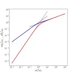 Plot of reduced wave-vector and attenuation coefficient as functions of reduced frequency ωτ. (In the labels, ωc = 1/τ)