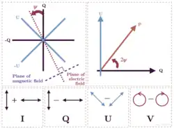 where is the total intensity, is the intensity of circular polarization, and is the intensity of linear polarization. The total intensity of polarization is , and the orientation and sense of rotation are given by