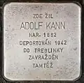 Adolf Kann was born on 6 June 1862 in Litvínov. His parents were Eduard and Julie Kann née Löwy. He was a merchant in Teplice and married Frederika née Freund in 1894. The couple had five children: Grete (born 1896), Erwin (born 1898), Gertrud (born 1901), Edith (born 1905) and Herbert (born 1909).[19][20][21][22] Prior to their deportation, Adolf Kann and his wife were registered in Prague in Böhmova 1329. On 20 July 1942, the couple was deported to Theresienstadt concentration camp with transport AA (his number on the transport was 48). From here he was deported on 22 October 1942, again together with his wife, with transport Bx (his number on this transport was the 1872) to Treblinka extermination camp. Adolf Kann and his wife Bedřiška were murdered in the course of the Shoah.