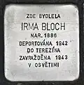 Irma Blochová née Löwy was born on 10 November 1886 in Teplice. Her parents were the physician Dr. Moritz Löwy and Flora née Auerbach. She married jurist Ludwig (Ludvík) Bloch. The couple had at least one son and one daughter: Lilly (born in 1913)[5] and Herbert. The last address of the couple before deportation was in Prague in Podskalská 40. On 16 July 1942 Irma Blochová and her husband were deported with transport AAr to Theresienstadt concentration camp. Her transport number was 74. On 6 September 1943 the couple was deported to Auschwitz concentration camp. There both husband and wife were murdered by the Nazi regime.[6][7][8]