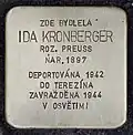 Ida Kronberger née Preuss was born on 19 January 1897. She married Walter Kronberger. The couple had two children, Adolf (Avraham) and Ruth. Ida Kronberger was deported with Transport Ba on 10 August 1942 from Prague to Theresienstadt concentration camp. Her transport number was 1145 of 1,474. On 6 October 1944, she was transferred to Auschwitz concentration camp with transport Eo. Her transport number was 200 of 1,550. There she lost her life.[8][9]