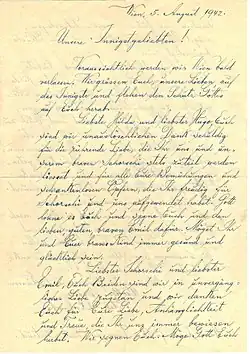 Kafková, Beila BertaBeila Berta Kafková was either born on 22 May 1883 or on 22 May 1884.[24] Her parents were Bernard Issakhar Kafka and Elenora Kafková. She was married to Max Beniamin Meir Kafka. The couple had two sons, Osvald (born 1908) and Otakar (born 1919), see above. She was a housewife. On 26 November 1942, she and her sons were deported from Klatovy to Theresienstadt concentration camp by transport Cd. Her transport number was 127 of 651. According to two serious sources she died in Theresienstadt, most probably on 13 December 1942. Therefore, the inscription on the Stolperstein, indicating that she was deported to Auschwitz in 1943 and was murdered there, might be wrong.[25][26]