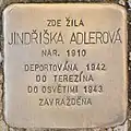 Adlerová, JindřiškaJindřiška Adlerová was born on 9 June 1910. Her parents were Jakub Adler and Růžena née Fröhlichová. She had an older sister, Anna (born 1906), and three brothers, Josef (born 1904), Ota (born 1908) and Jaroslav. At a certain period she lived in Prague II, Vladislavova 16. She, her mother and her brother Ota were deported on 26 November 1942 from Klatovy to Theresienstadt concentration camp by transport Cd. Her transport number was 171 of 651. On 23 January 1943, she was deported to Auschwitz concentration camp by transport Cr. Her transport number was 1048 of 2,017. She was murdered there.[5][6]