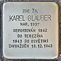 Glauber, KarelKarel Glauber, also Karl, was born on 14 June 1937 in Horažďovice. His parents were Valtr Glauber and Gertruda née Zinner (see below). On 26 November 1942, the boy was deported from Klatovy to Theresienstadt concentration camp by transport Cd. His transport number was 124 of 651. His mother was deported to Auschwitz concentration camp and murdered there on 16 January 1943. The little boy was deported on 18 December 1943 to Auschwitz by transport Ds. His transport number was 2219 of 2,503. There the Nazis took the life of the six years old boy.[11][12]