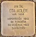 Adler, OtaOta Adler, also Otto, was born on 6 March 1908. His parents were Jakub Adler and Růžena née Fröhlichová. He had two sisters, Anna (born 1906) and Jindřiška (born 1910), and two brothers, Josef (born 1904) and Jaroslav. His father was a merchant, his mother a housewife. He was a medical student and single. He, his mother and his sister Jindřiška were deported on 26 November 1942 from Klatovy to Theresienstadt concentration camp by transport Cd. His transport number was 170 of 651. In Theresienstadt, the family was separated. First, in January 1943, his sister Jindřiška was deported to Auschwitz concentration camp. She was murdered there. Then, on 6 September 1943, Ota Adler was deported to Auschwitz by transport Dl. His transport number was 1498 of 2,484. He was murdered there.[3] At last, also their mother was also deported to Auschwitz on 15 December 1943. She was also murdered there.[4]