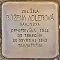 Adlerová, RůženaRůžena Adlerová née Fröhlichová was born on 16 June 1874. Her parents were Leopold Fröhlich and Barbora née Herrmann. She was married to Jakub Adler. The couple had at least three sons and two daughters, Josef (also Jozef, born 1904), Anna (born 1906, later named Pisinger), Ota (born 1908), Jindřiška (born 1910) and Jaroslav. Her husband was a merchant, she was a housewife. She and her children Ota and Jindřiška were deported on 26 November 1942 from Klatovy to Theresienstadt concentration camp by transport Cd. Her transport number was 169 of 651. In Theresienstadt, the family was separated. First, in January 1943, her daughter Jindřiška was deported to Auschwitz concentration camp. She was murdered there. Then, on 6 September 1943, her son Ota was deported to Auschwitz. He was murdered there too. At last, on 15 December 1943, also Růžena Adlerová was deported to Auschwitz by transport Dr. Her transport number was 44 of 2,519. She was murdered there.[7][8]