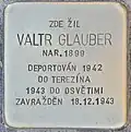 Glauber, ValtrValtr Glauber, also Walter, was born on 7 June 1899 in Horažďovice. His parents were David Glauber and Sophie née Langschur, also Zofie. He had four brothers: Emil (born 1895), Alfred (born 1897), Richard (born 1905) and Karl (born 1907). He was a merchant and married to Gertruda née Zinner (see below). The couple had a son, Karel, born in 1937 (see above). There is conflicting information about the place and the date of his death, ranging from 26 November 1942 in Ústí nad Labem to 18 July 1944 at Auschwitz concentration camp.[13]