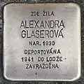 Glaserová, AlexandraAlexandra Glaserová was born on 11 January 1930. Her parents were Ařnost Glaser and Dr. Irma b. Schwarzová. She had at least one sister, Eva (born 1925). She was a student and was deported to the Łódź Ghetto on 21 October 1941 together with her parents and sister. There the 11-year-old girl was murdered by the Nazi regime, as were his parents.[10][11]