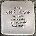 Glaser, AřnostAřnost Glaser was born on 15 August 1898. His parents were Moric Glaser and Julie b. Pánková. He was self-employed and married Dr. jur. Irma b. Schwarzová. The couple had at least two daughters, Eva and Alexandra (b. 1930). On 21 October 1941, Ařnost Glaser was deported together with his wife and daughters with transport B to the Łódź Ghetto. Their transport numbers were 468, 469 and 471 of 1,003. There, Ařnost Glaser, his wife and their younger daughter were murdered by the Nazi regime.[8][9]