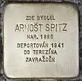 Spitz, AřnostAřnost Spitz was born on 4 October 1896 in Německý Brod. He was married to Anna b. Picková, the couple had two daughters, Marie (born 1928) and Sonja (born 1931). The last place of residence of the family before deportation was in Prague XIX, Hoferova 3. On 10 December 1941 father, mother and daughter were transported from Prague to the concentration camp Theresienstadt by transport L. Their transport numbers were 295, 296 and 298 of 1,006. There, the family was held captive for almost three years and was finally separated. On 28 September 1944, Ařnost Spitz was deported to Auschwitz concentration camp by Transport Ek. His transport number was 286 out of 1,550. Eight days later, on October 6, 1944, Anna and Sonja Spitzová were deported to Auschwitz. In the end, all three were murdered by the Nazi regime, however the date and exact place of death are only known of Ařnost Spitz: the 18 January 1945 in the Dachau concentration camp.[31][32]