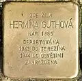 Guthová, HermínaHermína Guthová b. Hellerová, also Herma, was born on 23 July 1885. She married Dr. Otokar Guth The couple had at least one daughter, Anna, born on September 24, 1916. The last freely chosen address of the couple before deportation was in Prague I, Celetná 12. On July 5 in 1943, the two were deported by transport De from Prague to the Theresienstadt concentration camp. Their transport numbers were 538 and 539 of 604. On 14 August 1943 her husband was killed in Theresienstadt. Over a year later, on 23 October 1944, Hermína Guthová was deported and transported to Auschwitz concentration camp with Transport Et and murdered there. Their transport numbers were 1,158 from 1,714.[15][16]