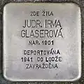 Dr. jur. Glaserová, IrmaIrma Glaserová b. Schwarzová was born on 2 August 1901 in Žatec. Her parents were Sigmund Schwarz and Kamila b. Töpferová. She studied law and married Ařnost Glaser. The couple had at least two daughters, Eva (born 1925) and Alexandra (born 1930). Together with her husband and daughters, Irma Glaserová was deported with transport B to the Łódź Ghetto In 1941. Their transport numbers were 468, 469 and 471 from 1,003. There, Irma Glaserová, her husband and their younger daughter were murdered by the Nazi regime.[12][13]