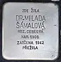 Dr. Šámalová, MiladaMilada Šámalová b. Cebeová was born on 11 April in 1906. Her parents were the doctor Jindřich Cebe (1870-1953) and Antonia b. Feyrerová (1874-1953). She completed a doctorate and married the entomologist Jaromír Šámal (see above), son of Přemysl Šámal and Anna Šámalová. She supported her husband in his research and was involved in two of his publications as co-author. The couple had two children, Jiří (1933-1976) and Alena (1937-2003). After the German occupation of the country in March 1939 and the closure of the Czech universities in November 1939, the husband and lawmaker joined the resistance movement. Her father-in-law was arrested in January 1940 and died in March 1941 after the Gestapo imprisonment in Berlin. Her husband was arrested in May 1942 and executed on June 5 in 1942 by the Nazi regime in Prague. Milada Šámalová was arrested and sent to Auschwitz concentration camp, when she wanted to inquire about her husband at the Gestapo. Both children, nine and five years old, were taken into custody by the National Socialists and deported to Łódź Ghetto together with the children from the destroyed village of Lidice. Afterwards, Jiří and Alena were given to a German family for"Germanization". After the end of the Nazi regime the children were found again and entrusted to their uncle for education. The daughter was later called Veselovská because of a marriage.
