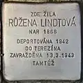 Lindtová, RůženaRůžena Lindtová was born on 5 December 1866. Her last residence in front of deportation was in Prague VII, Schillerova 43. On July 27, 1942, she was deported to Theresienstadt concentration camp by transport AAu. Their transport number was 250 from 1,002. Růžena Lindtová was murdered on March 13, 1943, in Theresienstadt.[17][18]