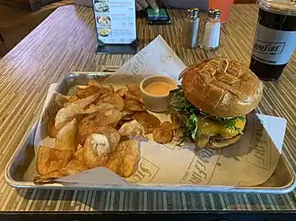 Items sold by the restaurant include: spinach dip, nachos, hot chicken, tortilla soup, cauliflower, tacos, breadsticks, cobb salad, caesar salad, garden salad, tri-tip, riblets, roast chicken, salmon filet, fettuccine Alfredo, pesto, marinara, rigatoni with bolognese sauce, macaroni and cheese, pizza, hawaiian pizza, French dip, club sandwich, chimichurri sub, cheeseburger, creamed corn, mashed potato, coleslaw, and potato salad, carrot cake, cheesecake, and chocolate brownie. It incorporates its tri-tip into many of its original items. Many dishes are inspired by Tex-Mex or Mexican cuisine.[6]