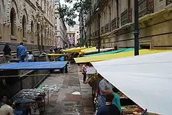 Finally, in October 2007 the streets of the Historic Center were cleared of vendors with much success, which was considered a victory for mayor Marcelo Ebrard.[8] However, toreros (literally "bullfighters") remain active in the area — people who sell merchandise from a tarp on the ground which converts to a bag that they can carry the merchandise in and carry it away when police show up to clear illegal street vendors.[1]