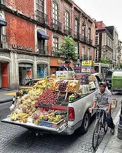• tianguis and mobile markets (mercados sobre ruedas): These markets take place in a designated place on certain days of the week, with a fixed schedule and supervised by a city inspector for compliance with weights and measurements. These markets are part of the strategy for the supply and distribution of food staples to the city.[10]