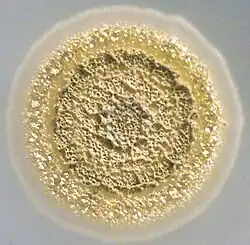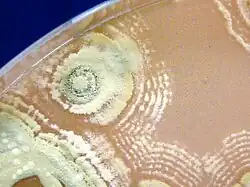 Mature Streptomyces sp myrophorea showing dusty green colonies with feint concentric rings