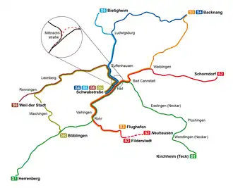| S 3 | Backnang – Winnenden – Waiblingen – Bad Cannstatt – Hauptbahnhof – Schwabstraße – Vaihingen – Rohr – Flughafen/Messe |