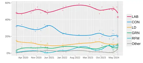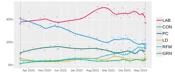 | 7 Jul 2024 | 2024 general election[2] | – | 22.1% | 27.0% | 15.0% | 11.1% | 12.2% | 6.2% | 6.4% | 4.9 | |