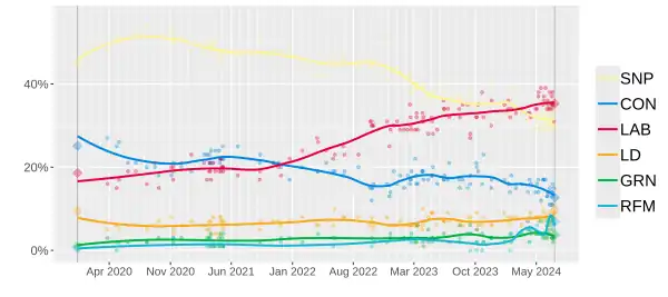 | 21–25 Jun 2024 | Savanta | The Scotsman | 1,042 | 34% | 14% | 34% | 7% | – | – | 7% | Tie |