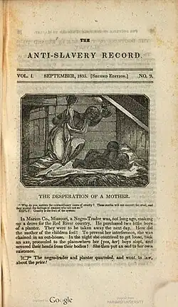 Similar crimes appear throughout slave narratives and in contemporary newspaper reports. In 1828, Annice was executed by the state of Missouri for deliberately drowning five children, two of which were her own.[19] In 1837, Dorcas Allen and her four children were put up for sale by her old owner's wife's new husband. While in James H. Birch's pen, she killed two of her four children rather than see them sold south. District Attorney Francis Scott Key advised Nathan Allen, husband of Dorcas and father of the children, to raise money to try to buy their freedom. With contributions from figures like John Quincy Adams it was done and Allen and her surviving children were freed.[20] In 1831, an enslaved woman in Tennessee reportedly drowned three of her children after being "chastised" by her enslaver.[21] In 1848, a man killed his wife and child with a pocket knife and tried to kill himself while "confined in one room" by a slave trader using the Covington, Kentucky jail.[22] In 1851 a Louisville, Kentucky newspaper reported that "a negro who had killed her new born babe by drowning it. The Georgetown Herald in commenting upon this said that death was the legal, but transportation the usual, penalty for such crime."[23]