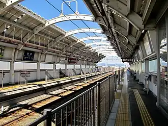 The station is an elevated station with dual opposed side platforms. It is staffed during daylight hours. The station building has automated ticket machines, and automated turnstiles which accept the NicePass smart card, as well as ET Card, a magnetic card ticketing system.