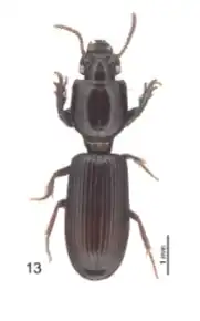 Adults reach a length of about 6.4–6.5 mm and have a glossy, piceous colour. The labrum, intermediate and hind leg are fuscous, while the antenna and tarsomere are fuscous. The supraantennal plates at the margin are slightly translucent-fuscous.[1]