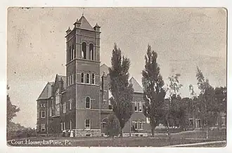 Sullivan County was established in 1847. At this time, the county commissioners were informed by their council that they could use any building in the county, and the commissioners each had their own office. Initial plans to build a courthouse in Sullivan County were made as early as 1847.[5] Despite some controversy about whether to place the courthouse in Forksville, Cherry Hill or Laporte, it was eventually decided that it would be located in Laporte.[6] In 1851 Michael Meylert constructed the 44 foot square, three-story brick courthouse. By 1893, the old courthouse's walls were buckling and held together with iron rods. It was torn down in 15 days.[7]
