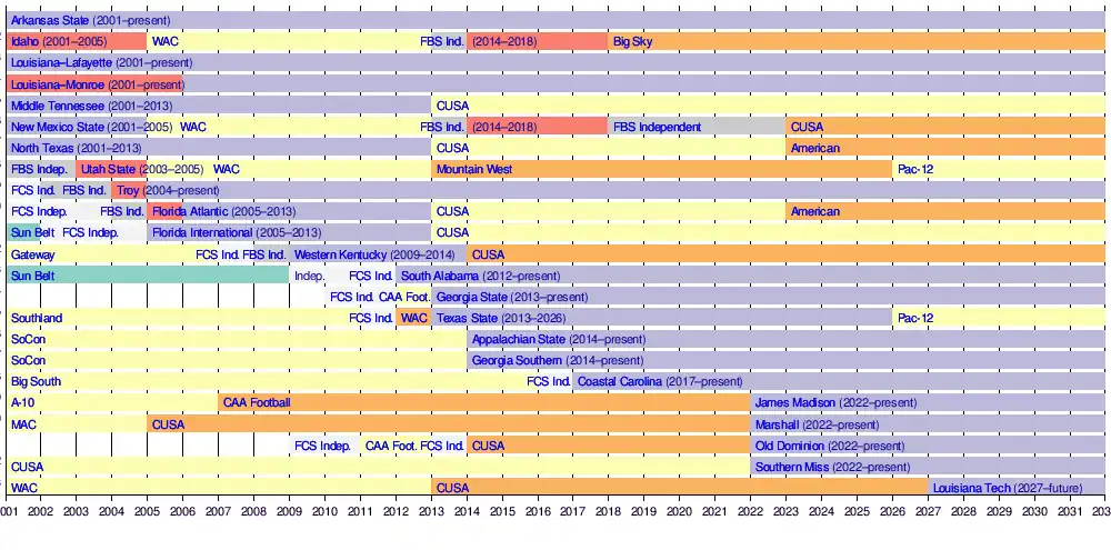Louisiana Tech Bulldogs footballConference USAWestern Athletic ConferenceSouthern Miss Golden Eagles footballConference USAOld Dominion Monarchs footballConference USANCAA Division I FCS independent schoolsColonial Athletic Association Football ConferenceNCAA Division I FCS independent schoolsMarshall Thundering Herd footballConference USAMid-American ConferenceJames Madison Dukes footballColonial Athletic Association Football ConferenceAtlantic 10 ConferenceCoastal Carolina Chanticleers footballNCAA Division I FCS independent schoolsBig South ConferenceGeorgia Southern Eagles footballSouthern ConferenceAppalachian State Mountaineers footballSouthern ConferencePac-12 ConferenceWestern Athletic ConferenceNCAA Division I FCS independent schoolsSouthland ConferenceGeorgia State Panthers footballColonial Athletic Association Football ConferenceNCAA Division I FCS independent schoolsSouth Alabama Jaguars footballNCAA Division I FCS independent schoolsSun Belt ConferenceConference USAWestern Kentucky Hilltoppers footballNCAA Division I FBS independent schoolsNCAA Division I FCS independent schoolsGateway Football ConferenceConference USAFIU Panthers footballNCAA Division I FCS independent schoolsSun Belt ConferenceAmerican Conference (NCAA)Conference USAFlorida Atlantic Owls footballNCAA Division I FBS independent schoolsNCAA Division I FCS independent schoolsTroy Trojans footballNCAA Division I FBS independent schoolsNCAA Division I FCS independent schoolsPac-12 ConferenceMountain West ConferenceWestern Athletic ConferenceUtah State Aggies footballNCAA Division I FBS independent schoolsAmerican Conference (NCAA)Conference USANorth Texas Mean Green footballConference USANCAA Division I FBS independent schoolsNCAA Division I FBS independent schoolsWestern Athletic ConferenceNew Mexico State Aggies footballConference USAMiddle Tennessee Blue Raiders footballLouisiana–Monroe Warhawks footballLouisiana Ragin' Cajuns footballBig Sky ConferenceNCAA Division I FBS independent schoolsWestern Athletic ConferenceIdaho Vandals footballArkansas State Red Wolves football