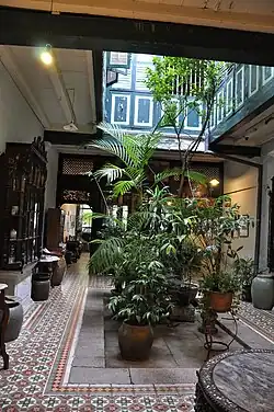 The building was constructed circa 1880. It was built to be a residential townhouse. A superb example of a Straits Settlements merchant's home and with an unusual length of over 130 feet (40 metres), the building is a living example of the architectural heritage of Penang. Many of the building's original features, which include a cozy courtyard garden, a quaint timber staircase, beautifully patterned floor tiles, and large beams, survive to this day. The interior is equally splendid. Old blackwood Straits Chinese furniture and ornately carved wooden screens add an ambiance of the olden days. The fidelity to the past extends to the kitchen, which has the original firewood stove and kitchen utensils.[2]