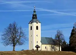 The local church, built on a hill above the settlement, is dedicated to Saint Oswald and is Late Gothic with the date 1527 in its vaulted sanctuary. The nave dates to 1644 and originally had a flat ceiling but was vaulted in 1849. Frescos on the arch leading to the sanctuary were painted by Jernej of Loka in 1534.[7]