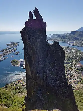 Geita or Svolværgeita[4] (Northern Sami: Spålla) is a 150-metre (490 ft) tall pinnacle at the southwest face of the mountain Fløyfjellet on the island of Austvågøya in the Lofoten archipelago. The 569-metre (1,867 ft) high Fløyfjellet is located on the edge of the town of Svolvær in Vågan Municipality in Nordland county, Norway. The first recorded time a climber reached the summit of Svolværgeita was on 1 August 1910 by Ferdinand Schjelderup, Alf Bonnevie Bryn, and Carl Wilhelm Rubenson.[3][5][6]