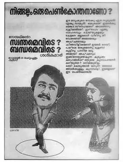 Swanthamevide? Bandhamevide? (transl. Where is kinship? Where is relationship?) is a 1984 Indian Malayalam-language family drama film directed by J. Sasikumar and written by S. L. Puram Sadanandan from a story by Sasikumar. It is a remake of Sasikumar's 1965 film Thommante Makkal which Ponnamma respsied her role.[1] The film stars Mohanlal, Jose Prakash, Swapna, Lalu Alex, Menaka, and Adoor Bhasi. It features music composed by Johnson. The plot follows the issues cropping up inside a family after the marriage of two sons.[2][3]