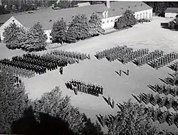 In 1944, the Swedish Armed Forces School for Secondary Education was established and students from all service branches were given the opportunity to receive a realexamen or studentexamen. At the school, there was also room for the Technical Program of the Swedish Navy. The Swedish Army Non-Commissioned Officer School was reorganized to include the non-commissioned officer's course, as well as a boarding school for the students at the Swedish Armed Forces School for Secondary Education.[1] In 1950, the Commissariat Program ended at the non-commissioned officer's course. In 1952, training of conscripts staff assistants in the army was added. In 1955, training of conscript interpreters was added to the Swedish Army Non-Commissioned Officer School. In 1960, the training was changed at the non-commissioned officer's course according to the guidelines that were contributed by the 1954 Officer's Investigation (1954 års befälsutredning). Among other things, the quartermaster training ceased in favor of training in combat technology and troop command. In 1960, the Swedish Army Non-Commissioned Officer School was subordinated to the Uppland Signal Regiment (S 1) in regards of administration, except for the commissariat service and the health service. In 1966, the training of conscripts staff assistants and interpreters was transferred to the newly organized Swedish Army School of Staff Work and Communications (Arméns stabs- och sambandsskola, StabSbS). In 1967, the commissariat service was subordinate to S 1. In 1972, the Swedish Army Non-Commissioned Officer School changed its name to the Swedish Army Company Officer School in connection with the introduction of a new service system in the entire Swedish Armed Forces.[1]