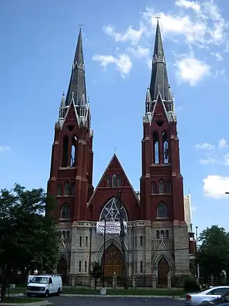 Sweetest Heart of Mary is one of the largest Gothic Revival churches in the Midwest, and perhaps the most impressive. The church is constructed of red brick in a cruciform shape with a cross gabled roof. The facade on Russell boasts a rusticated stone lower level with a triple portal, a pointed arch structure, and a stone balustrade atop everything. Two towers flank the entrance, topped with identical spires, which are capped with buttresses and detailed with crosses.[3]