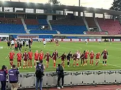 In the 2023 World Cup qualifiers, Switzerland ended their campaign by winning 15–0 against Moldova, setting a new record for goals in a match for the team.[6] Switzerland then qualifies for the 2023 World Cup, 8 years after its only participation. It again manages to pass the 1st round and even finishes first in group A, thanks to an entry victory against the Philippines, novices in the competition (2–0), then two goalless draws in turn against Norway, then New Zealand, the host country of the event, resisting the offensive tendencies of the Scandinavians and the Oceanians. In the next round, the Nati will meet Spain, 2nd in Group C and eventual winners of the tournament, an opponent who has never made it past the round of 16 either. Switzerland are heavily beaten by La Roja (1–5) despite a fairly quick equalizer thanks to an unlikely own goal by Spanish defender Laia Codina and stops at the same stage as 8 years ago.