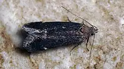 The wingspan is 10.5–12 mm.[2] The forewings are rather glossy fuscous-black, tinged with violet and minutely speckled with pale scales. The hindwings are satiny-grey.[3]